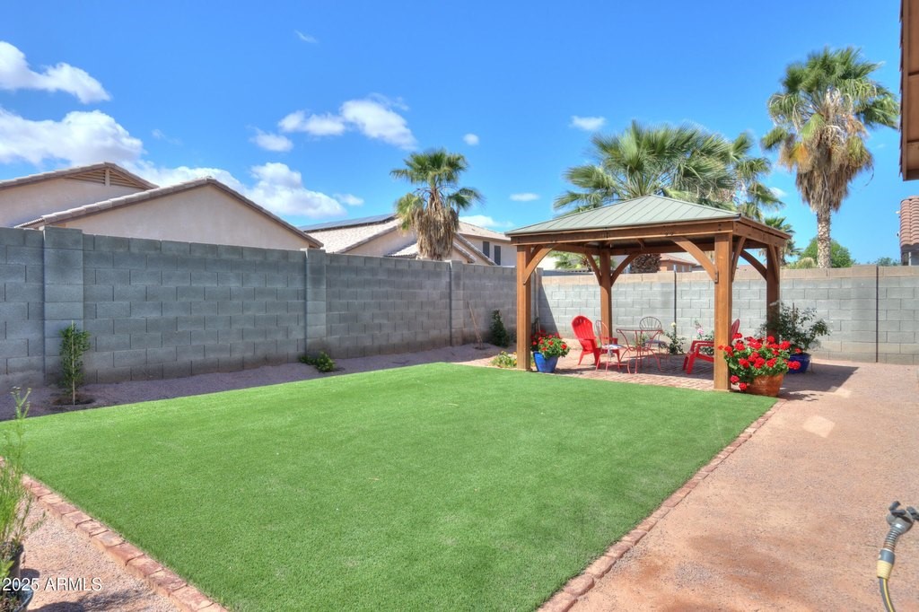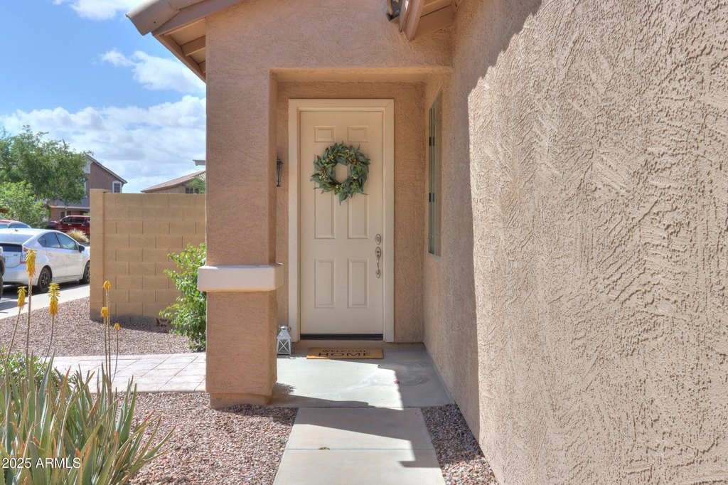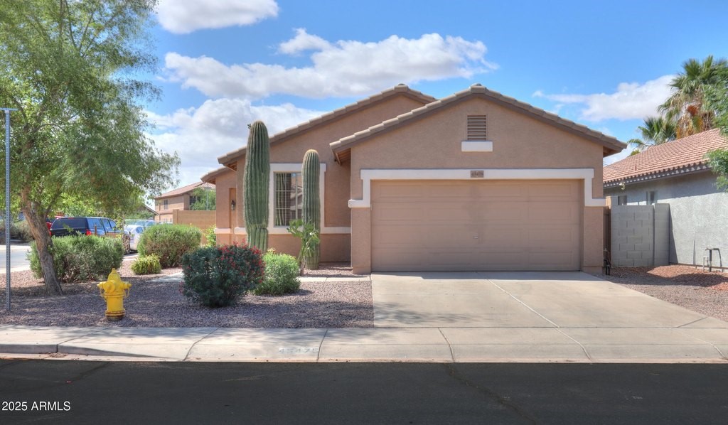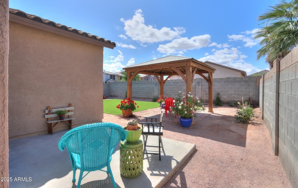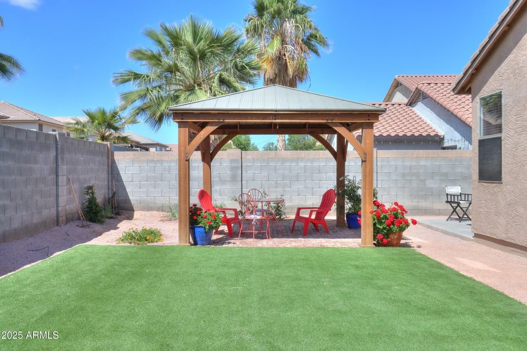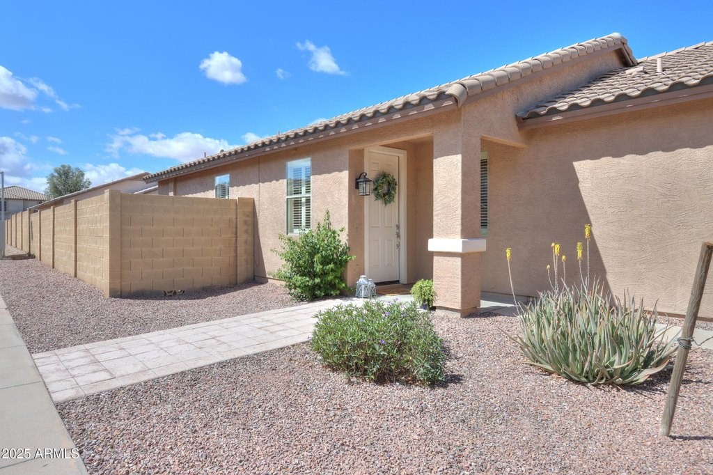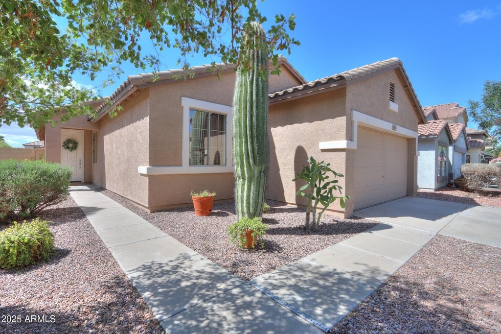 This move-in ready home is ideal for first-time buyers, seasonal residents, or anyone seeking a low-maintenance lifestyle. Located on a spacious corner lot, the home features fresh interior paint throughout, updated bathrooms, and a bright kitchen with new stainless steel appliances. The open layout creates a welcoming feel, perfect for quiet evenings or entertaining. Step outside to your private backyard retreat, fearturing easy-care turf and a pergola for added shadeperfect for enjoying Arizona's beautiful weather. Nestled in the heart of Maricopa Meadows, you'll love being close to scenic parks, walking paths, a community lake, and even a disc golf course. Schools for all ageselementary through high schoolare conveniently located right within the neighborhood.