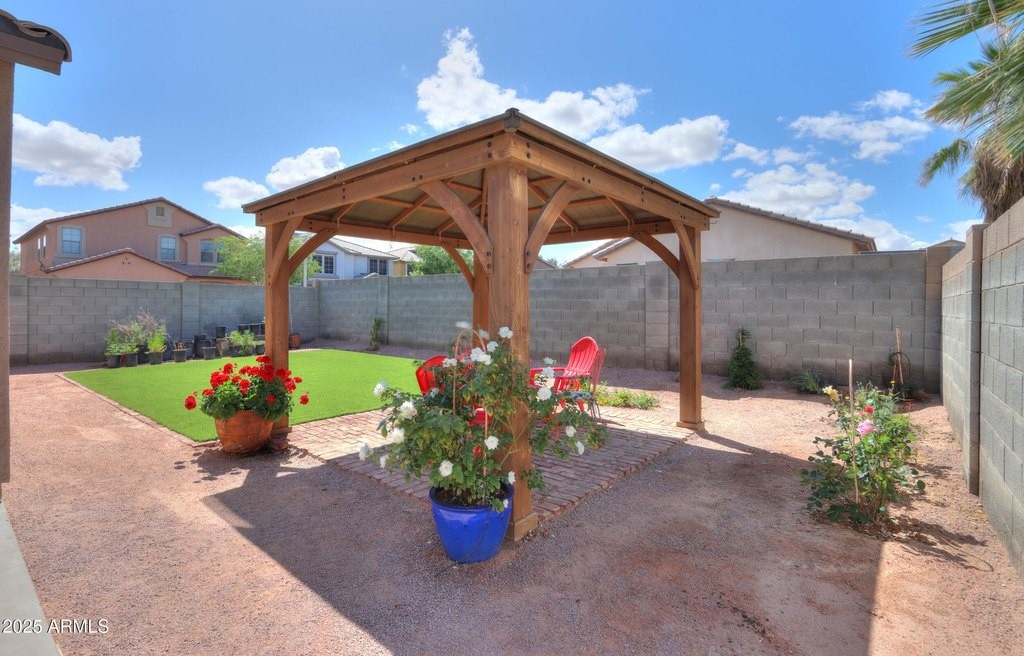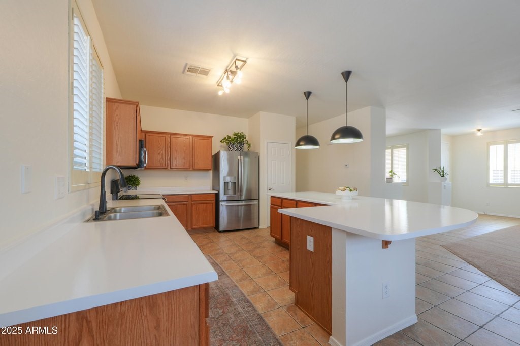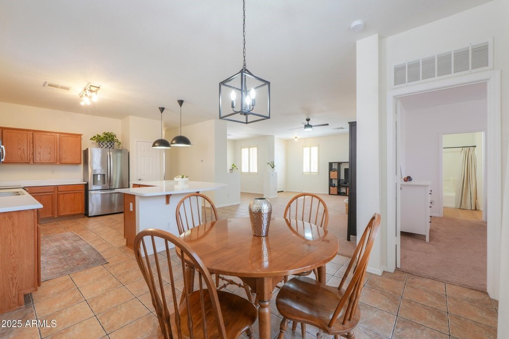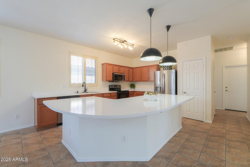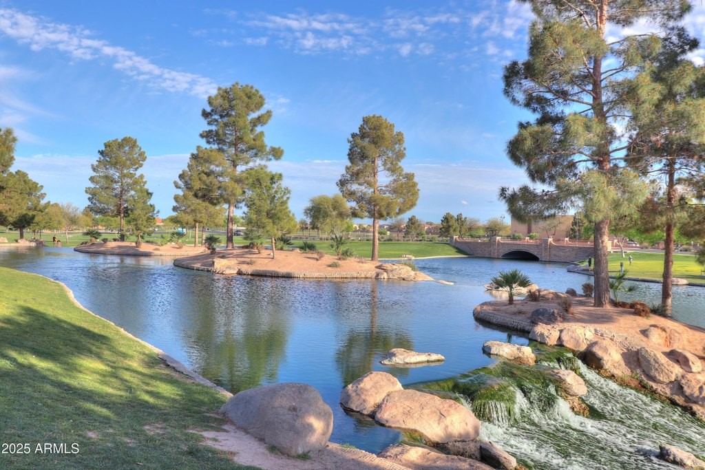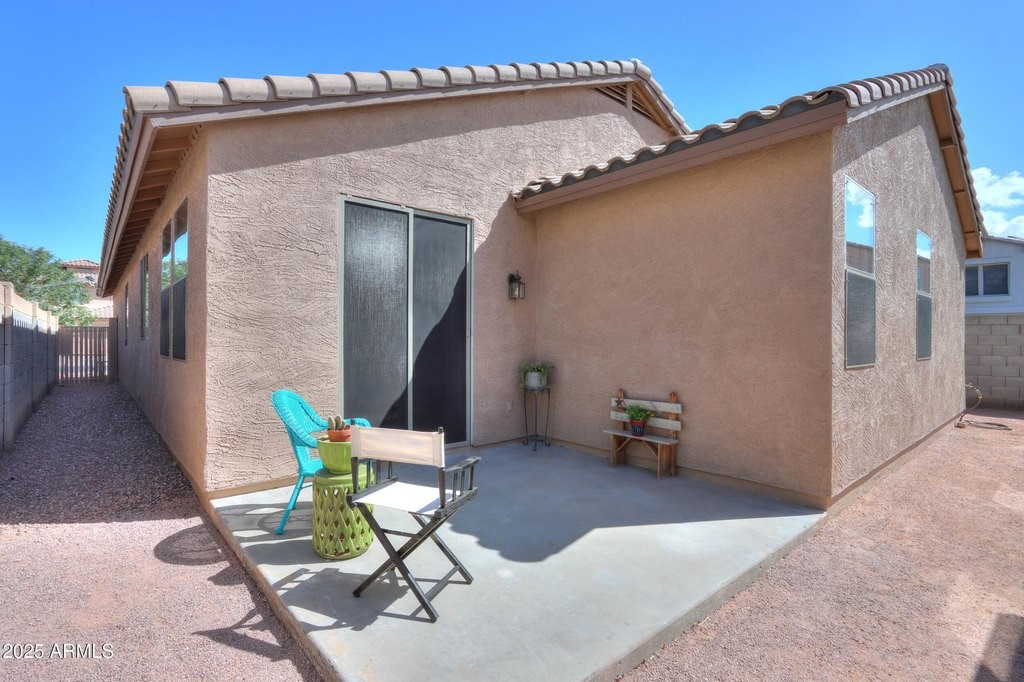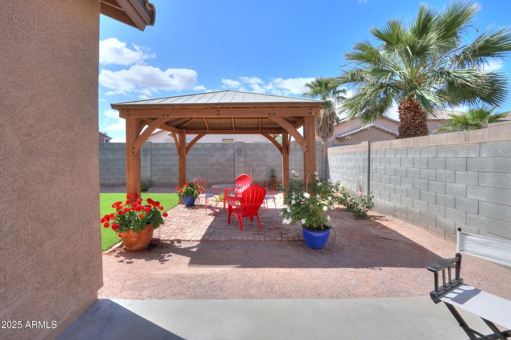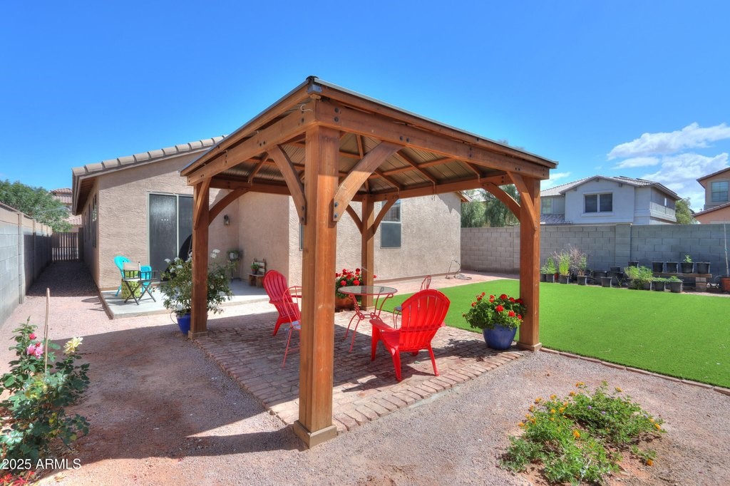 This move-in ready home is ideal for first-time buyers, seasonal residents, or anyone seeking a low-maintenance lifestyle. Located on a spacious corner lot, the home features fresh interior paint throughout, updated bathrooms, and a bright kitchen with new stainless steel appliances. The open layout creates a welcoming feel, perfect for quiet evenings or entertaining. Step outside to your private backyard retreat, fearturing easy-care turf and a pergola for added shadeperfect for enjoying Arizona's beautiful weather. Nestled in the heart of Maricopa Meadows, you'll love being close to scenic parks, walking paths, a community lake, and even a disc golf course. Schools for all ageselementary through high schoolare conveniently located right within the neighborhood.